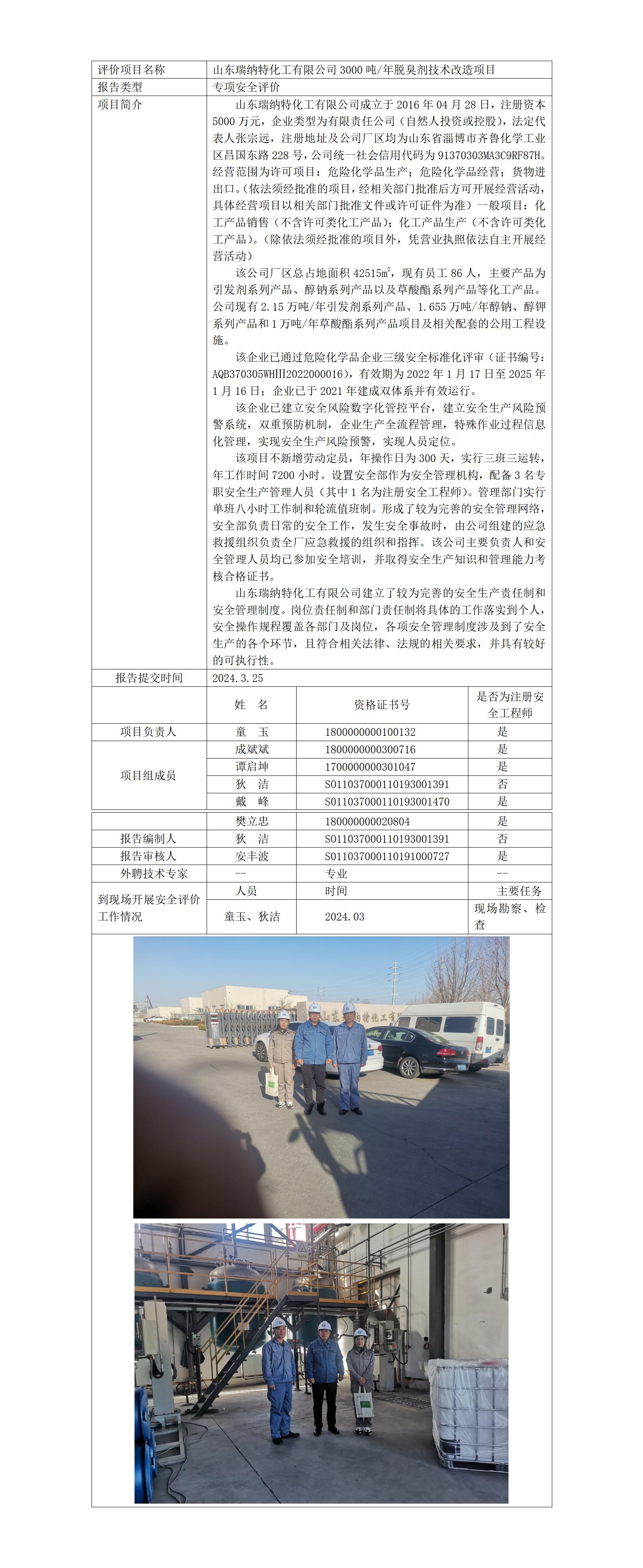 山东瑞纳特化工有限公司3000吨/年脱臭剂技术改造项目专项安全评价